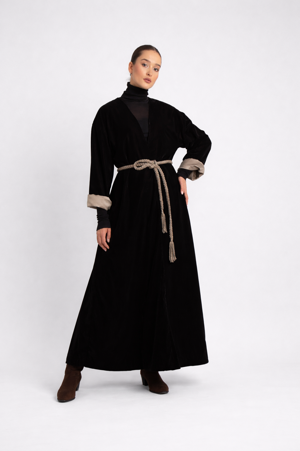 A soft velvet bisht with a handmade MACRAME rope belt for a refined artisanal touch.